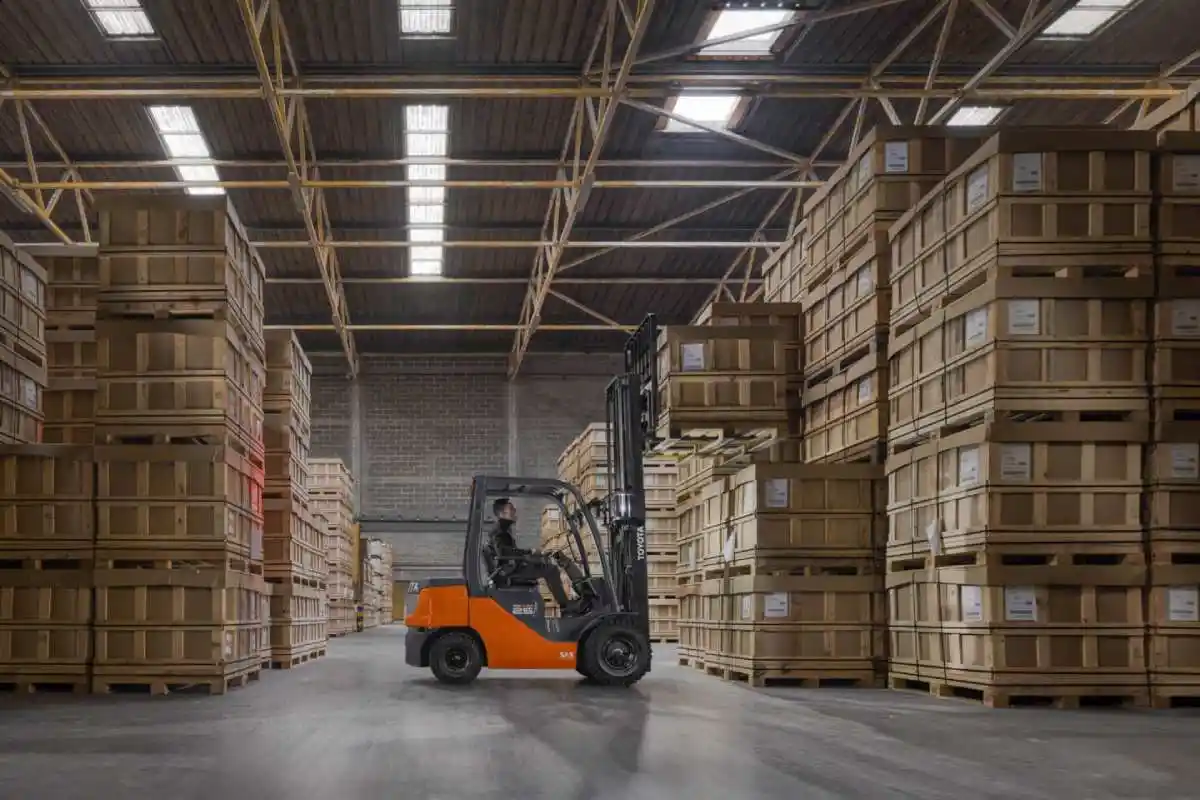 Operación Eficiente con Carretilla Elevadora en Almacén Moderno